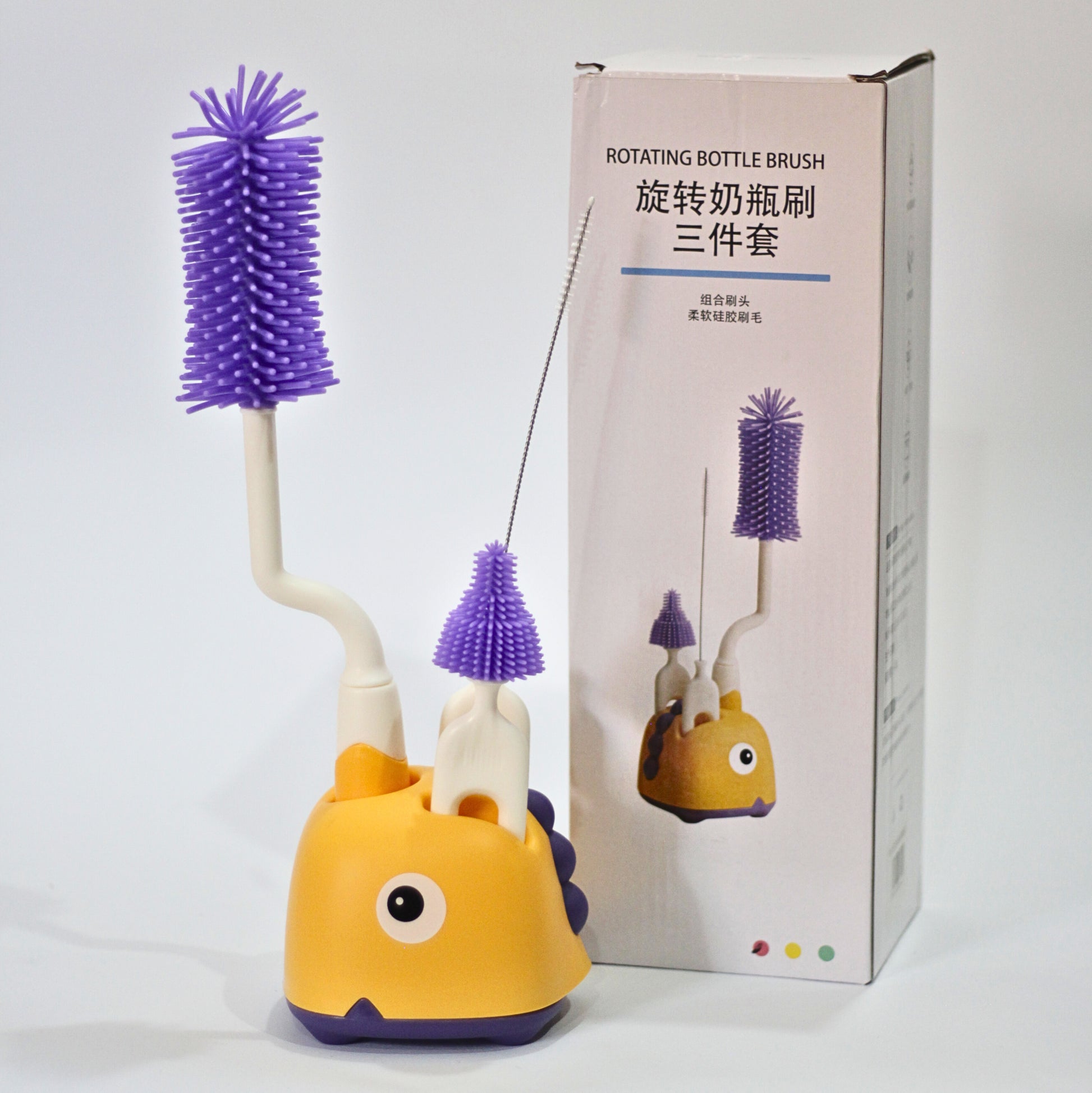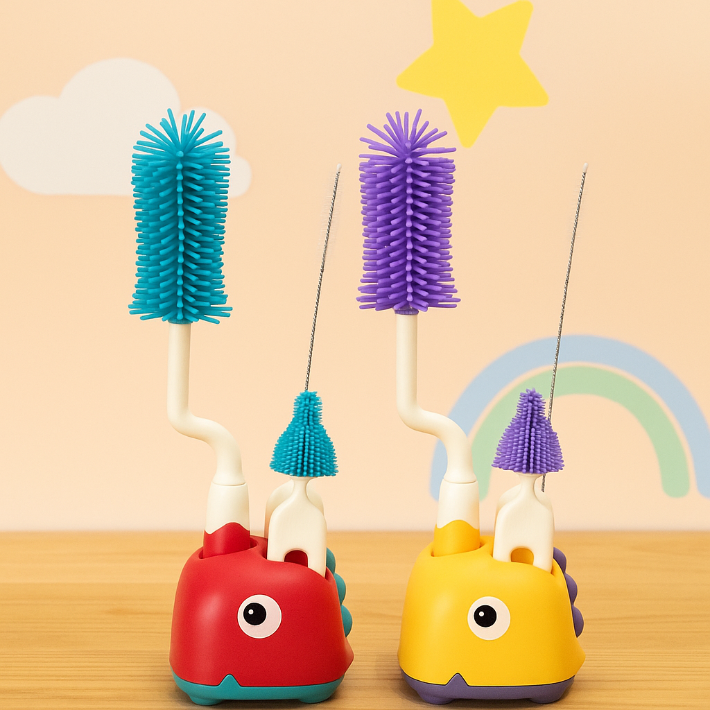 "Make cleaning fun and effortless with this adorable dinosaur-themed rotating brush set! Featuring soft, durable silicone bristles, it’s perfect for cleaning bottles, cups, and baby accessories without scratching. The 360° rotating handle ensures a thorough clean from every angle, while the playful design keeps both kids and parents smiling. Complete with multiple brush sizes to tackle every nook and cranny — practical, hygienic, and irresistibly cute!"