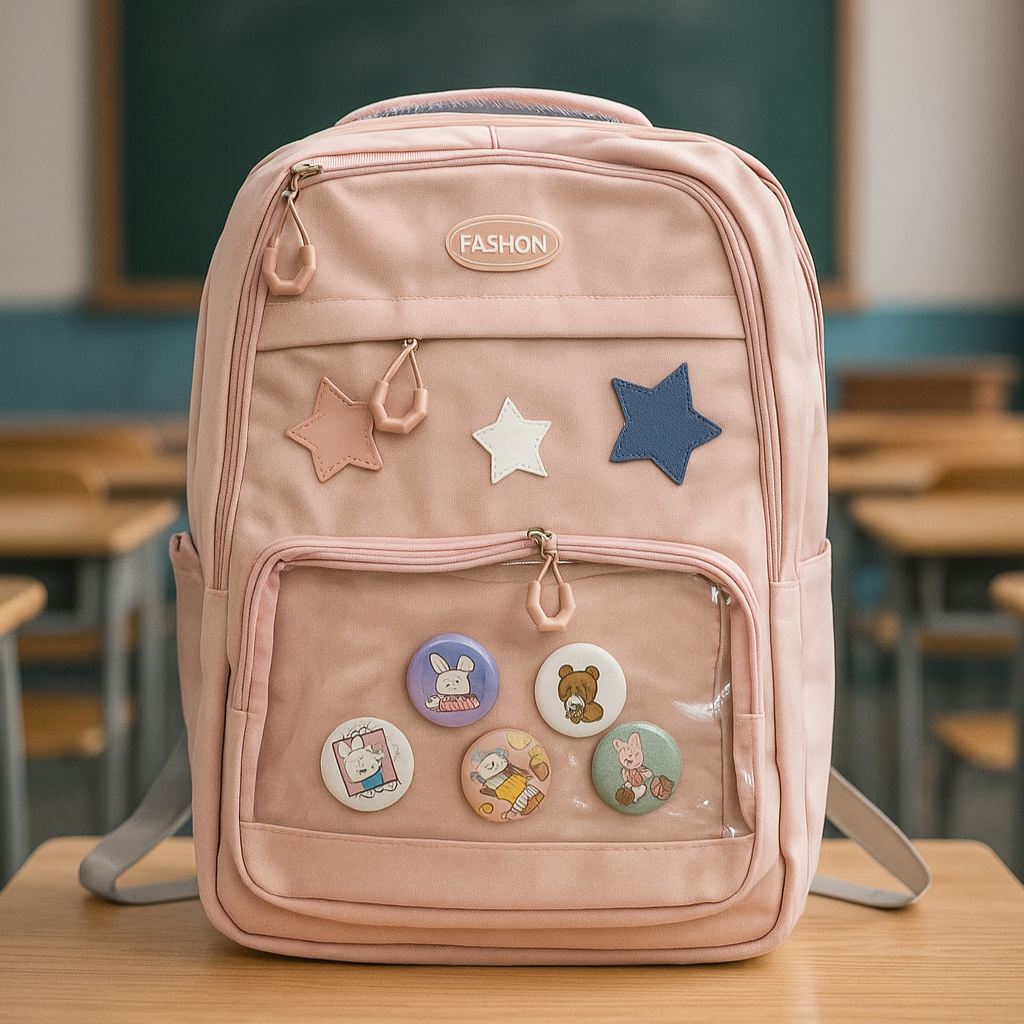 A stylish pastel pink school backpack designed for everyday use. It features two soft star appliqués on the front and a transparent pocket showcasing six cute cartoon badges for a fun, personalized look. With multiple compartments and durable zippers, it’s perfect for school, travel, or casual outings. Comfortable adjustable straps ensure easy carrying all day.